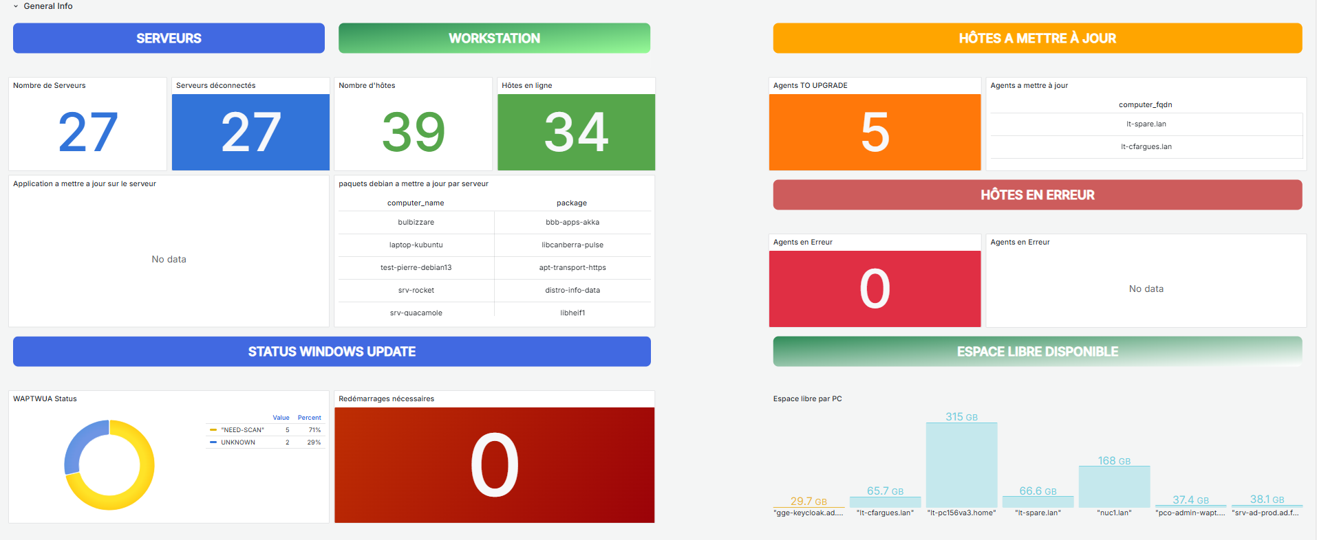 Grâce à Grafana, vous pouvez créer des tableaux de bord sur mesure pour vous aider dans la gestion de votre parc informatique. Suivez le nombre de postes à mettre à jour, le suivi des mises à jour Windows, l’état de votre dépôt privé, visualisez les paquets à mettre à jour en fonction du store Tranquil IT. Définissez vos propres indicateurs pour disposer d’un tableau de bord utile au quotidien dans votre métier d’administrateur système.Ecrivez quelque chose ...